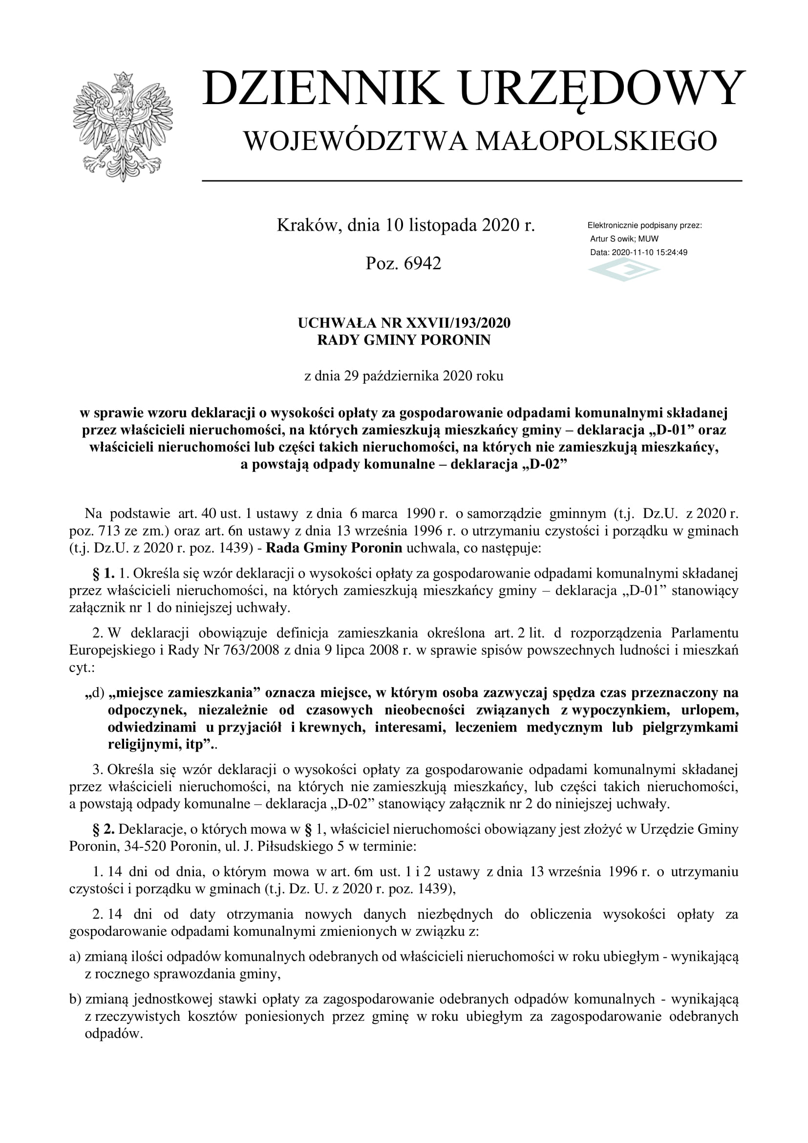 UCHWAŁA NR XXVII/193/2020 RADY GMINY PORONIN z dnia 29 października 2020 r.