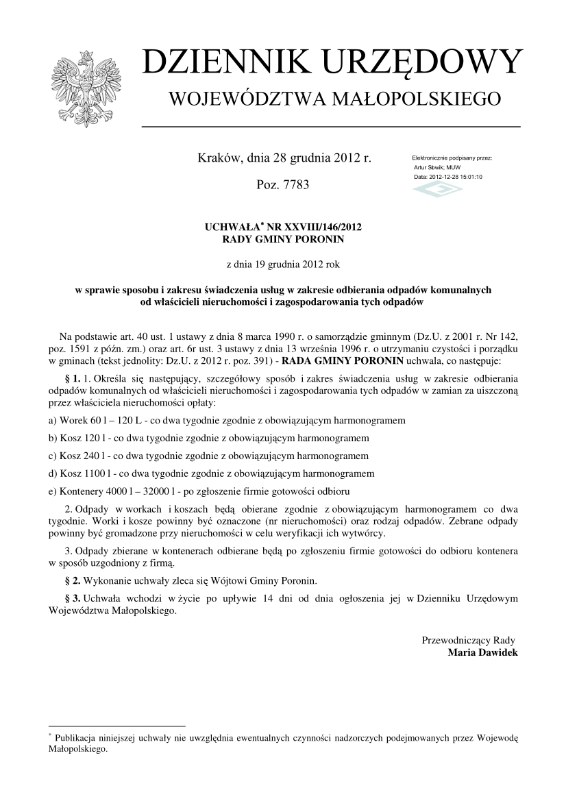UCHWAŁA NR XXVIII/146/2012 RADY GMINY PORONIN z dnia 19 grudnia 2012 r.