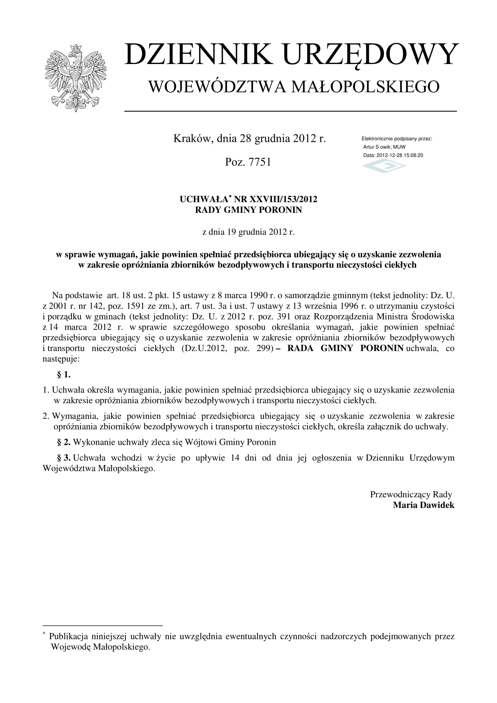 UCHWAŁA NR XXVIII/153/2012 RADY GMINY PORONIN z dnia 19 grudnia 2012 r.