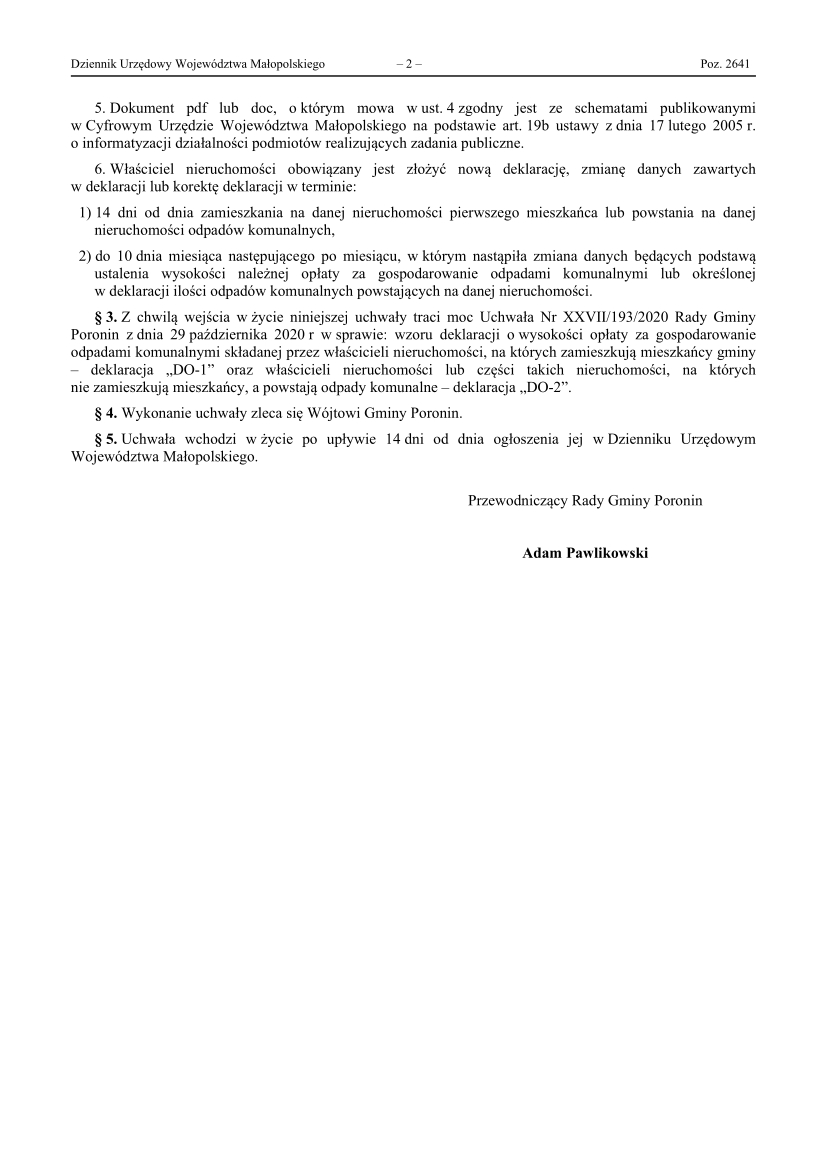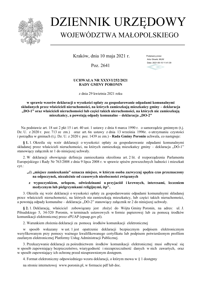 UCHWAŁA NR XXXVI/252/2021 RADY GMINY PORONIN z dnia 29 kwietnia 2021 roku