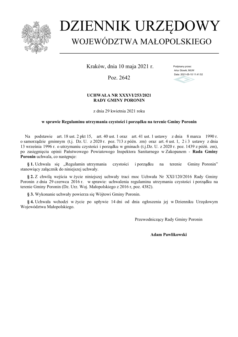 UCHWAŁA NR XXXVI/253/2021 RADY GMINY PORONIN z dnia 29 kwietnia 2021 roku