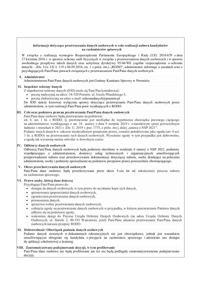 1. Kandydat na rachmistrza spisowego w NSP 2021 może składać dokumenty osobiście w siedzibie urzędu gminy lub za pośrednictwem: poczty elektronicznej na skrzynkę e-mailową urzędu:kadry@poronin.pl, platformy ePUAP albo operatora pocztowego (w tym m.in. Poczty Polskiej, firm kurierskich).