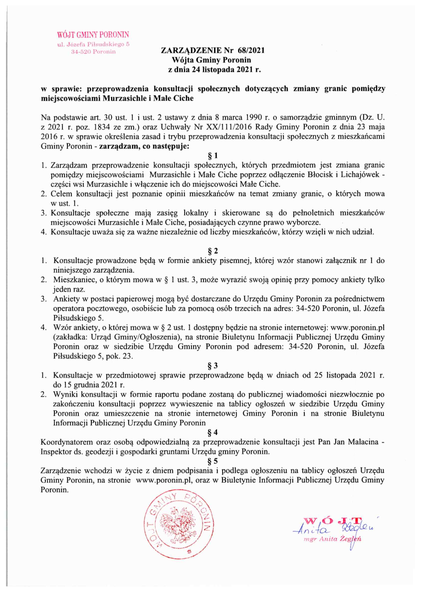 Zarządzenie Wójta Gminy Poronin w sprawie przeprowadzenia konsultacji społecznych dotyczących zmiany granic pomiędzy miejscowościami Murzasichle i Małe Ciche