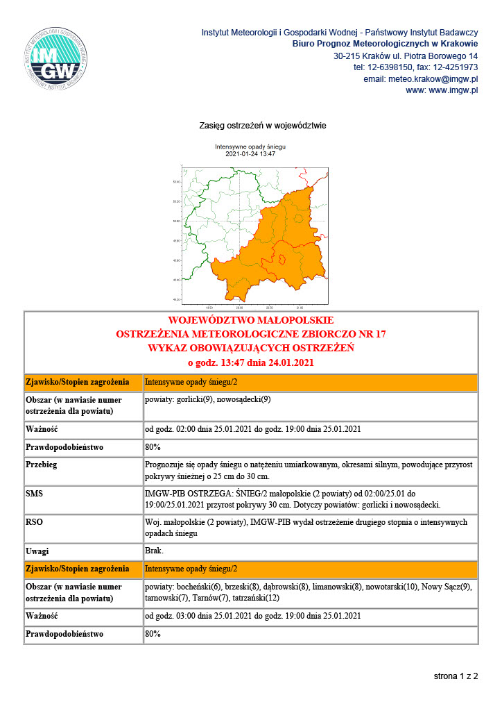 IMGW-PIB OSTRZEGA: ŚNIEG/2 małopolskie (9 powiatów) od 03:00/25.01 do 19:00/25.01.2021 przyrost pokrywy 25 cm. Dotyczy powiatów: bocheński, brzeski, dąbrowski, limanowski, nowotarski, Nowy Sącz, tarnowski, Tarnów i tatrzański.