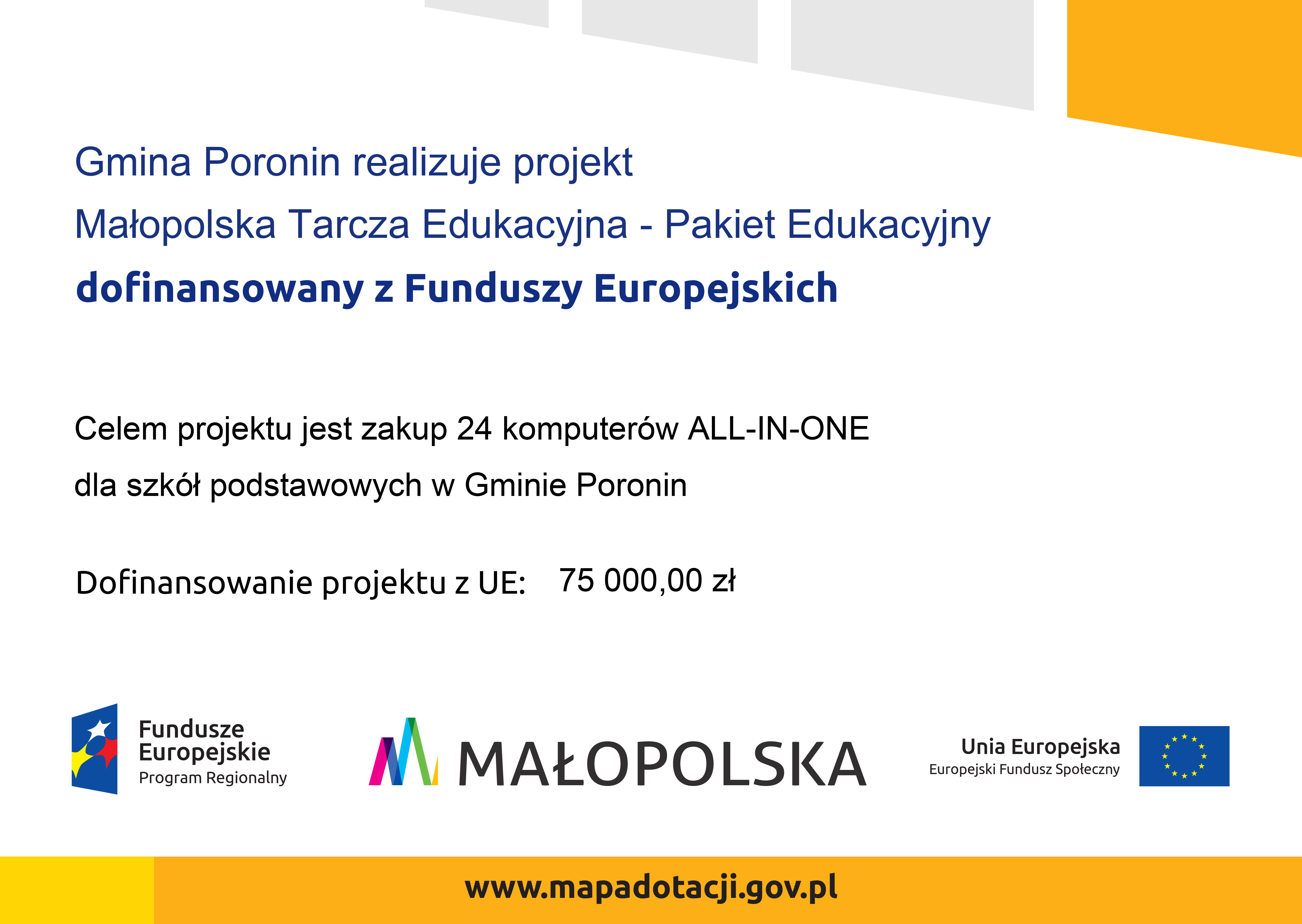 W dniu wczorajszym przekazano do szkół podstawowych z Gminy Poronin kolejne komputery. W ramach oszczędności po przetargu Gmina Poronin zakupiła kolejne 9 komputerów All-In-One do szkół podstawowych. Środki pochodzą z grantu Małopolska Tarcza Antykryzysowa – Pakiet Edukacyjny Regionalnego Programu Operacyjnego Województwa Małopolskiego na lata 2014–2020, finansowanego ze środków Europejskiego Funduszu Społecznego i budżetu państwa. W sumie udało się zakupić 33 komputery typu All-In-One.
