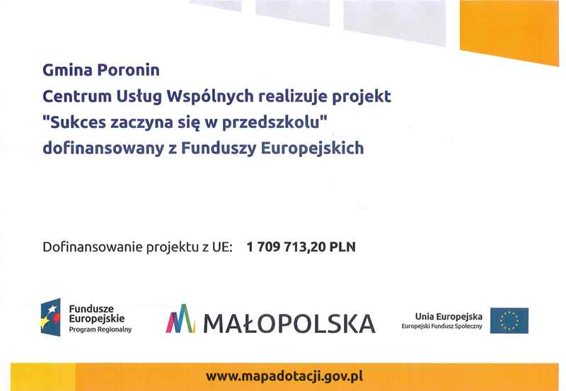 Gmina Poronin podpisała umowę z Małopolskim Centrum Przedsiębiorczości o dofinansowanie projektu: „Sukces zaczyna się w przedszkolu” w ramach Regionalnego Programu Operacyjnego Województwa Małopolskiego na lata 2014 – 2020, Oś Priorytetowa Wiedza i Kompetencje Działanie 10.1, Poddziałanie 10.1.2 z Europejskiego Funduszu Społecznego, którego realizatorem jest Centrum Usług Wspólnych w Poroninie.