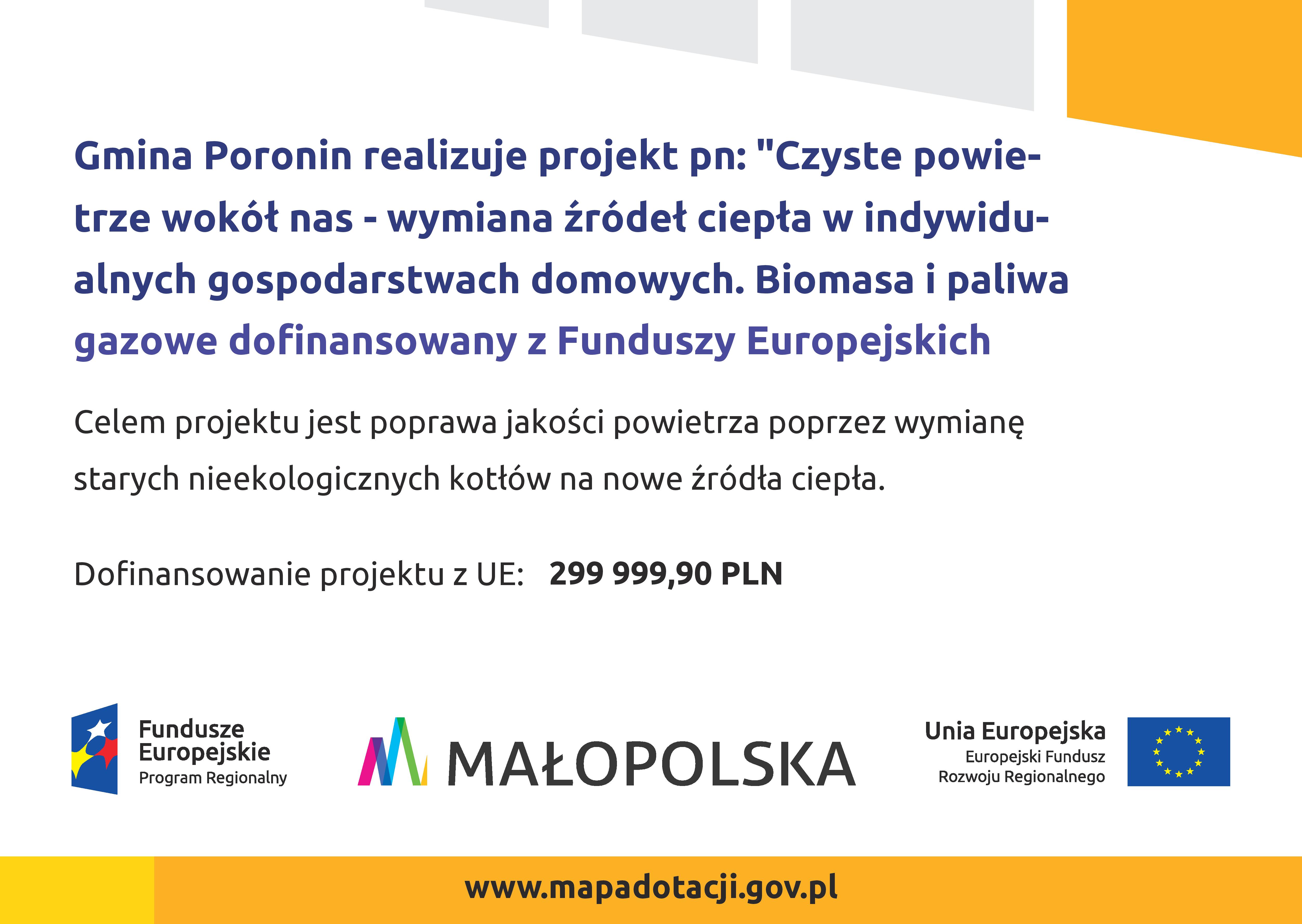Gmina Poronin podpisała umowę o dofinansowanie projektu: „Czyste powietrze wokół nas – wymiana źródeł ciepła w indywidualnych gospodarstwach domowych. Biomasa i paliwa gazowe” w ramach Regionalnego Programu Operacyjnego Województwa Małopolskiego na lata 2014 – 2020, Oś Priorytetowa 4., Regionalna polityka energetyczna, Działanie 4.4 Redukcja emisji zanieczyszczeń do powietrza, Poddziałanie 4.4.2 Obniżenie poziomu niskiej emisji - spr z Europejskiego Funduszu Rozwoju Regionalnego.