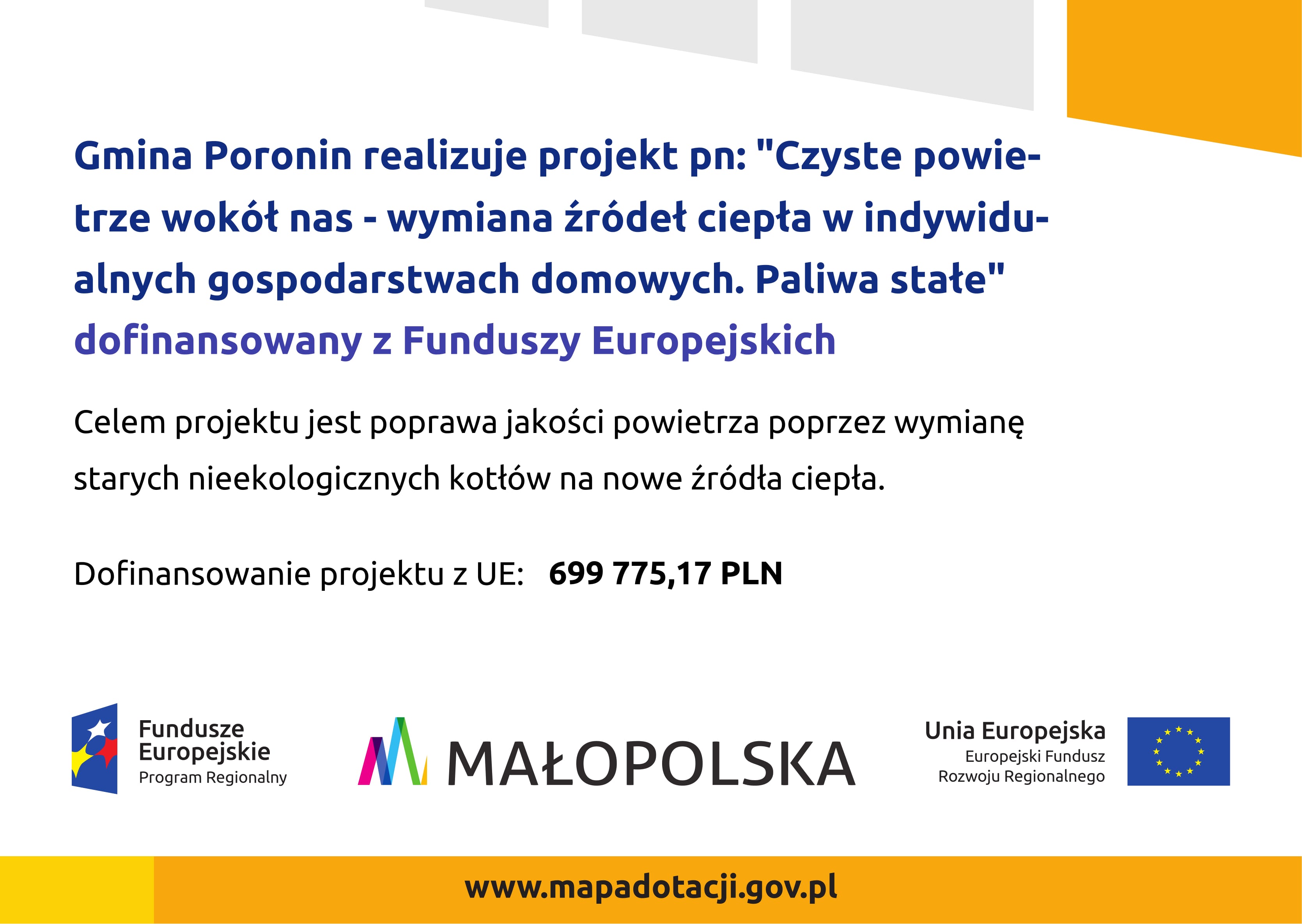 Gmina Poronin podpisała umowę o dofinansowanie projektu: „Czyste powietrze wokół nas – wymiana źródeł ciepła w indywidualnych gospodarstwach domowych. Paliwa stałe” w ramach Regionalnego Programu Operacyjnego Województwa Małopolskiego na lata 2014 – 2020, Oś Priorytetowa 4., Regionalna polityka energetyczna, Działanie 4.4 Redukcja emisji zanieczyszczeń do powietrza, Poddziałanie 4.4.3 Obniżenie poziomu niskiej emisji (paliwa stałe) - spr z Europejskiego Funduszu Rozwoju Regionalnego.