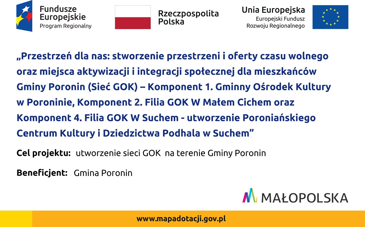 Gmina Poronin rozpoczęła realizację projektu „Przestrzeń dla nas: stworzenie przestrzeni i oferty czasu wolnego oraz miejsca aktywizacji i integracji społecznej dla mieszkańców Gminy Poronin (Sieć GOK) – Komponent 1. Gminny Ośrodek Kultury w Poroninie, Komponent 2. Filia GOK W Małem Cichem oraz Komponent 4. Filia GOK W Suchem - utworzenie Poroniańskiego Centrum Kultury i Dziedzictwa Podhala w Suchem”