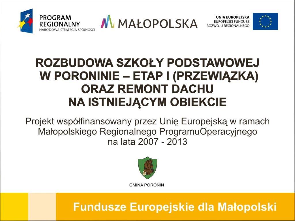 Gmina Poronin otrzymała dofinansowanie w ramach Indywidualnych Projektów Kluczowych Małopolskiego Regionalnego Programu Operacyjnego na lata 2007-2013 w ramach Działania 6.2 Rozwój Obszarów Wiejskich, Schemat B. Infrastruktura społeczna w tym edukacja i sportowa.