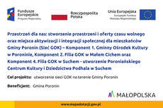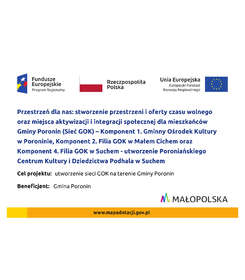 Realizacja inwestycji w Suchem to ostatnia z trzech części projektu rewitalizacji w Gminie Poronin. Na różnych etapach realizacji są już rewitalizacja w Małem Cichem oraz w Poroninie. Projekt jest dofinansowany z Regionalnego Programu Operacyjnego Województwa Małopolskiego na lata 2014-2020.