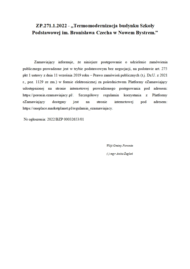 ZP.271.1.2022 - „Termomodernizacja budynku Szkoły Podstawowej im. Bronisława Czecha w Nowem Bystrem.”