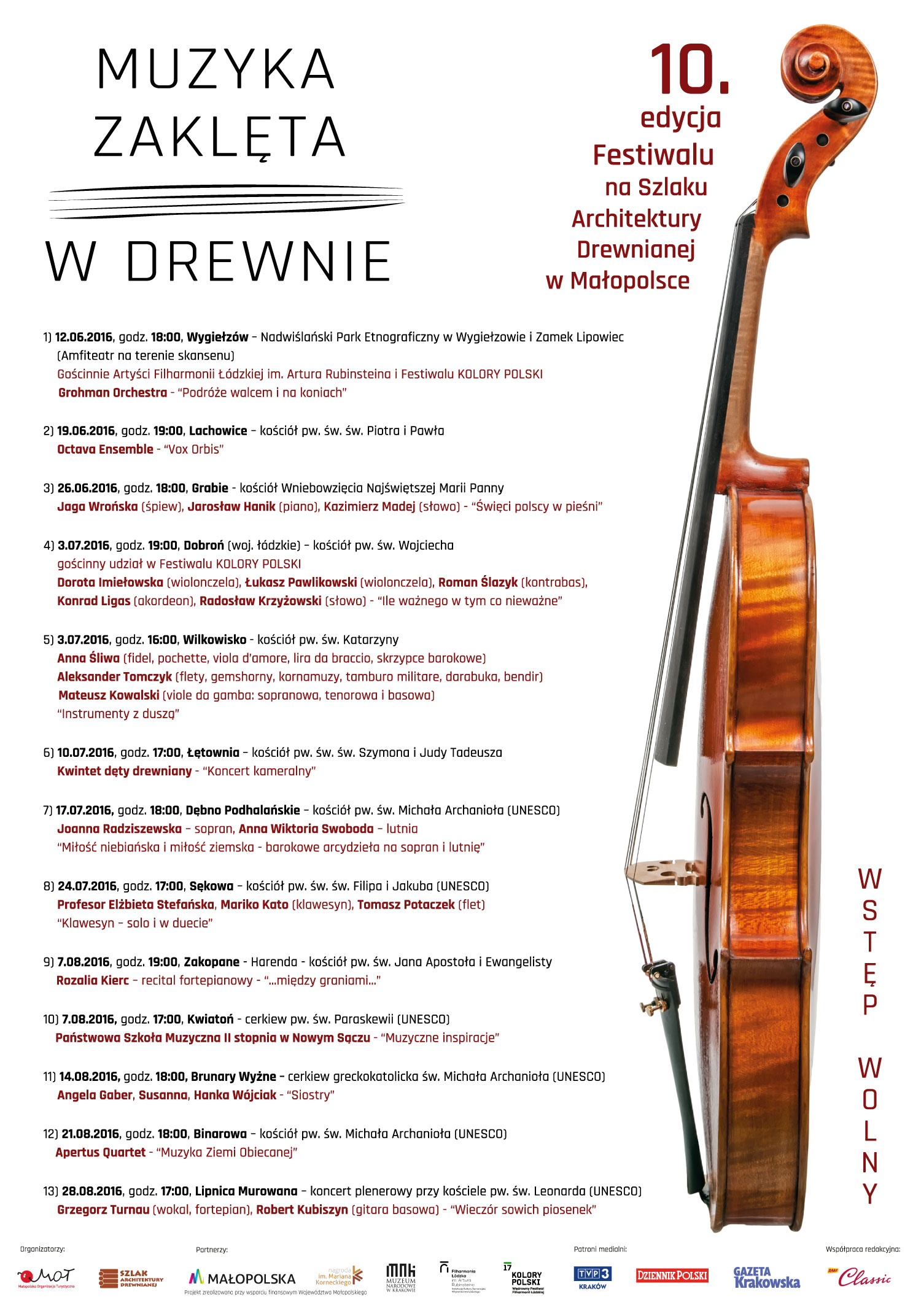 Festiwal „Muzyka Zaklęta w Drewnie” już od dziesięciu lat rozbrzmiewa na Szlaku Architektury Drewnianej w Małopolsce. W letnie niedziele w kolejnych „drewnianych” zakątkach Małopolski występują wysokiej klasy artyści, a także wyjątkowo uzdolnieni muzycy młodego pokolenia. Do tej pory odbyło się już ponad 100 koncertów!