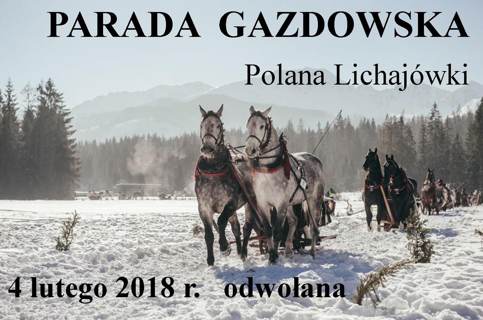 Urząd Gminy Poronin informuje, że Parada Gazdowska 2018 w Murzasichlu na Polanie Lichajówki z powodu braku odpowiedniej ilości pokrywy śnieżnej potrzebnej do przygotowania bezpiecznej trasy przejazdu zaprzęgów, zaplanowana na 4 lutego 2018 r. zostaje odwołana.