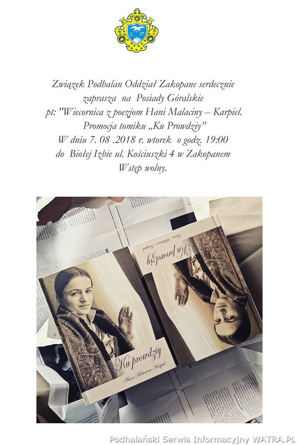 Związek Podhalan Oddział Zakopane serdecznie zaprasza na Posiady Góralskie pt.: "Wiecornica z poezjom Hani Malaciny – Karpiel". Promocja tomiku „Ku Prowdziy” w dniu 7 sierpnia 2018 r. wtorek o godz. 19:00 do Biołej Izbie ul. Kościuszki 4 w Zakopanem. Wstęp wolny.