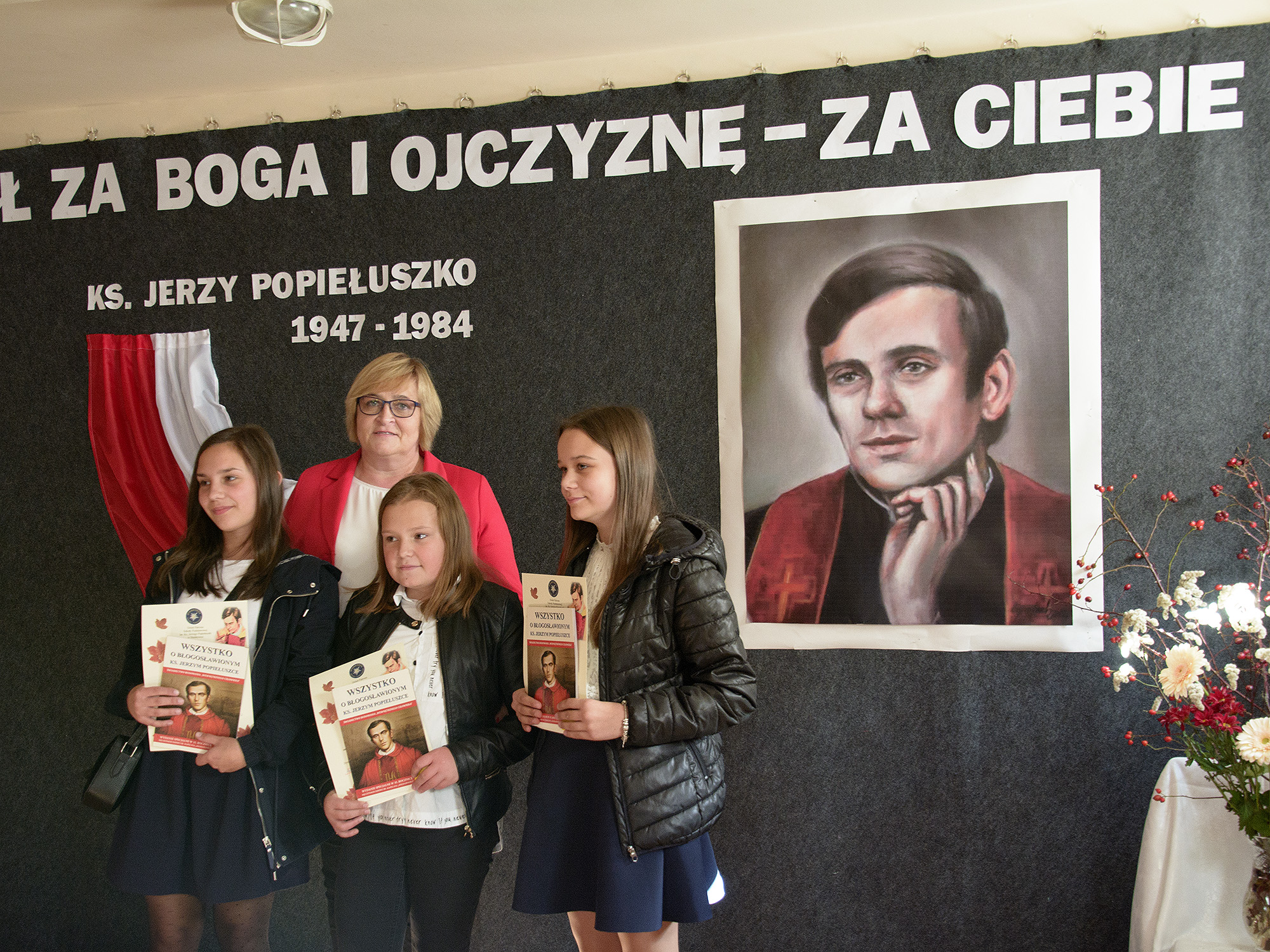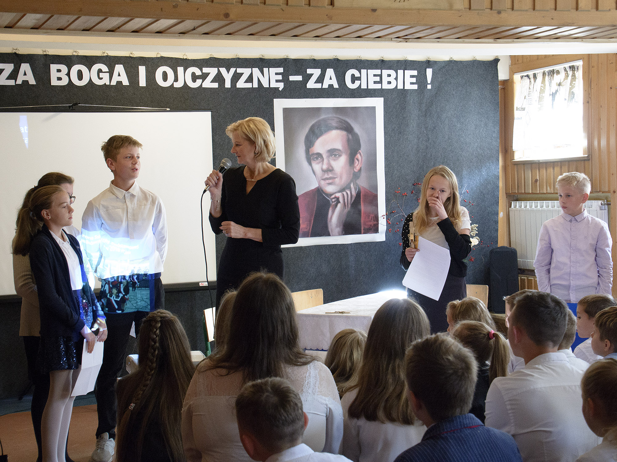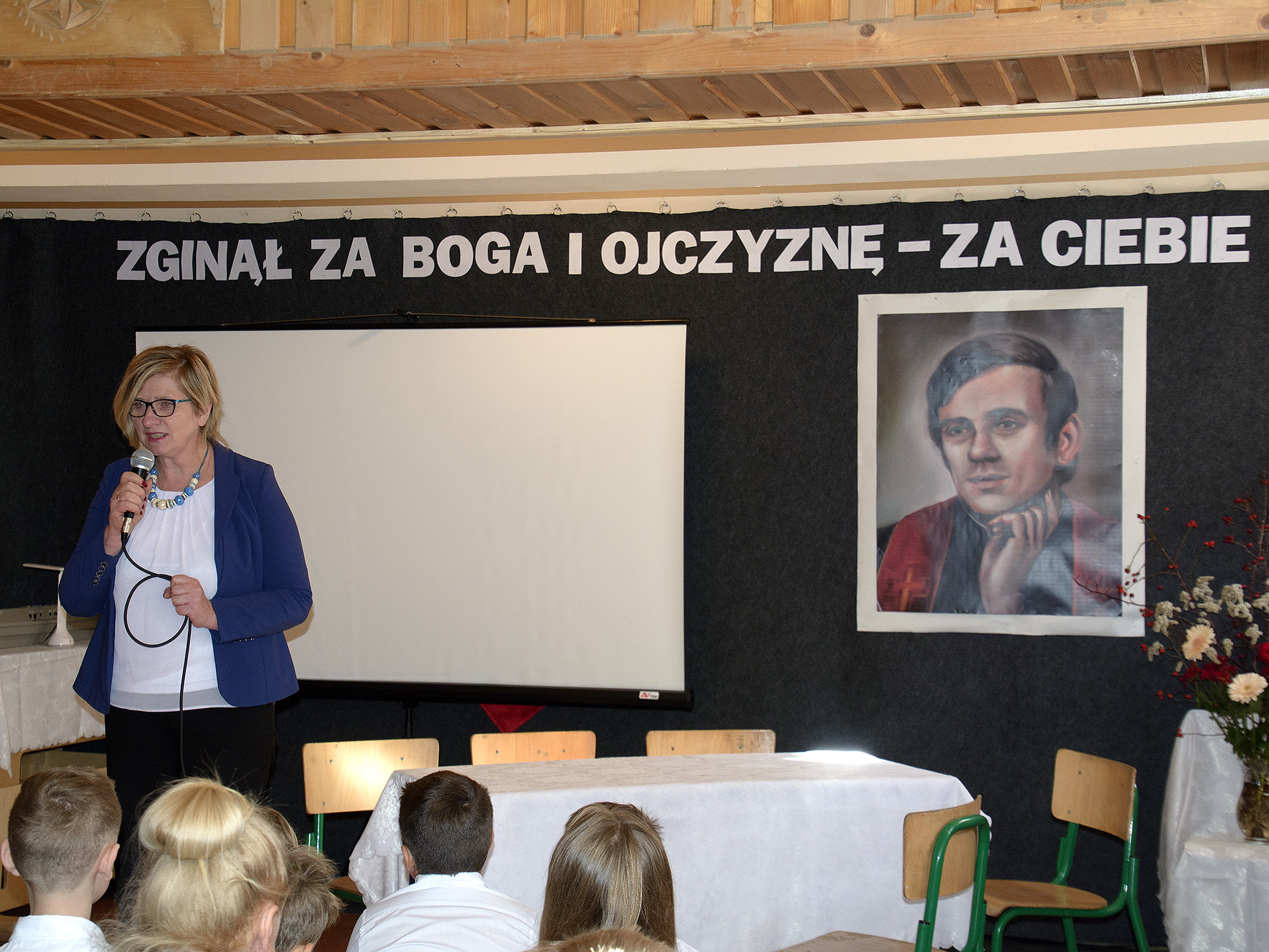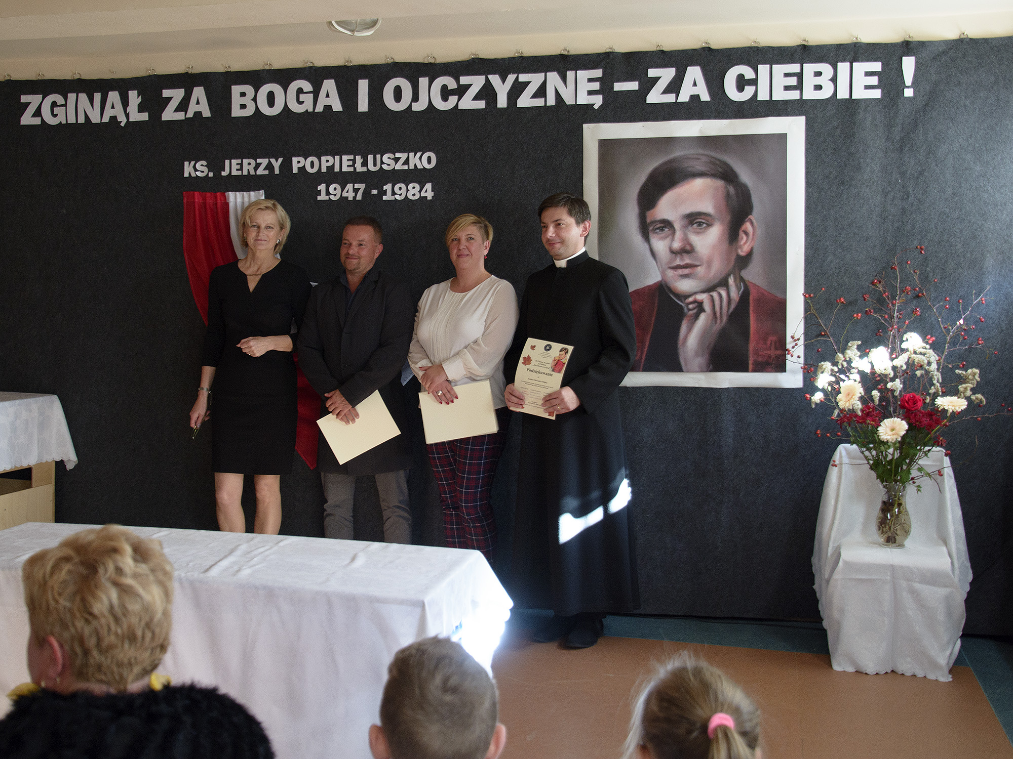 Święto Patrona to szczególny dzień w życiu szkolnej społeczności. Jego wyjątkowy charakter, podkreślili swoją obecnością przedstawiciele władz Gminy Poronin – pani Wójt Anita Żegleń , Przewodniczący Rady pan Adam Pawlikowski, Sekretarz Gminy pani Maria Budz oraz Dyrektor Centrum Usług Wspólnych pani Beata Chałupka. Życzyli oni Dyrekcji, Gronu Pedagogicznemu i Rodzicom, aby duch Patrona wpisał się w program wychowawczy Szkoły. Uczniom zaś, aby wartości, którym był wierny ks. Popiełuszko pozostały dla nich drogowskazem.