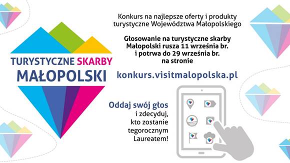 W imieniu Wicemarszałka Województwa Małopolskiego zapraszamy do wzięcia udziału w głosowaniu i odkrywaniu nowych nieznanych Skarbów Małopolski! Głosowanie rozpoczęło się 11 września br i potrwa do 29 września. Regulamin konkursu oraz formularz do głosowania dostępne są na specjalnie przygotowanej przez Województwo Małopolskie stronie internetowej konkurs.visitmalopolska.pl