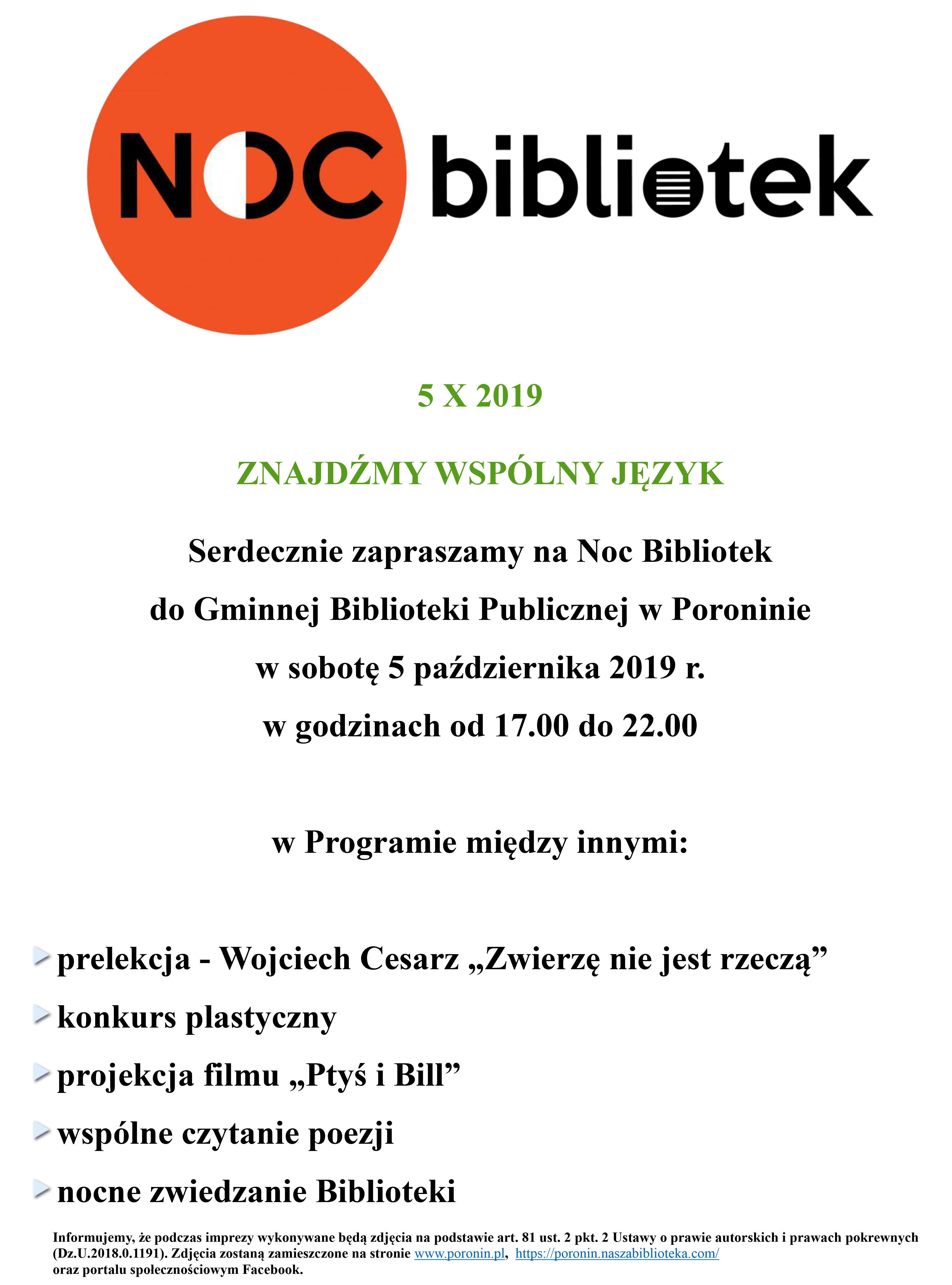 Gminna Biblioteka Publiczna im. Jana Kasprowicza w Poroninie bierze udział w V ogólnopolskiej akcji NOC BIBLIOTEK pod hasłem „Znajdźmy wspólny język”. Zapraszamy serdecznie w dniu 5 października 2019 r. (sobota) w godzinach od 17.00 do 22.00 do udziału w tym wydarzeniu.