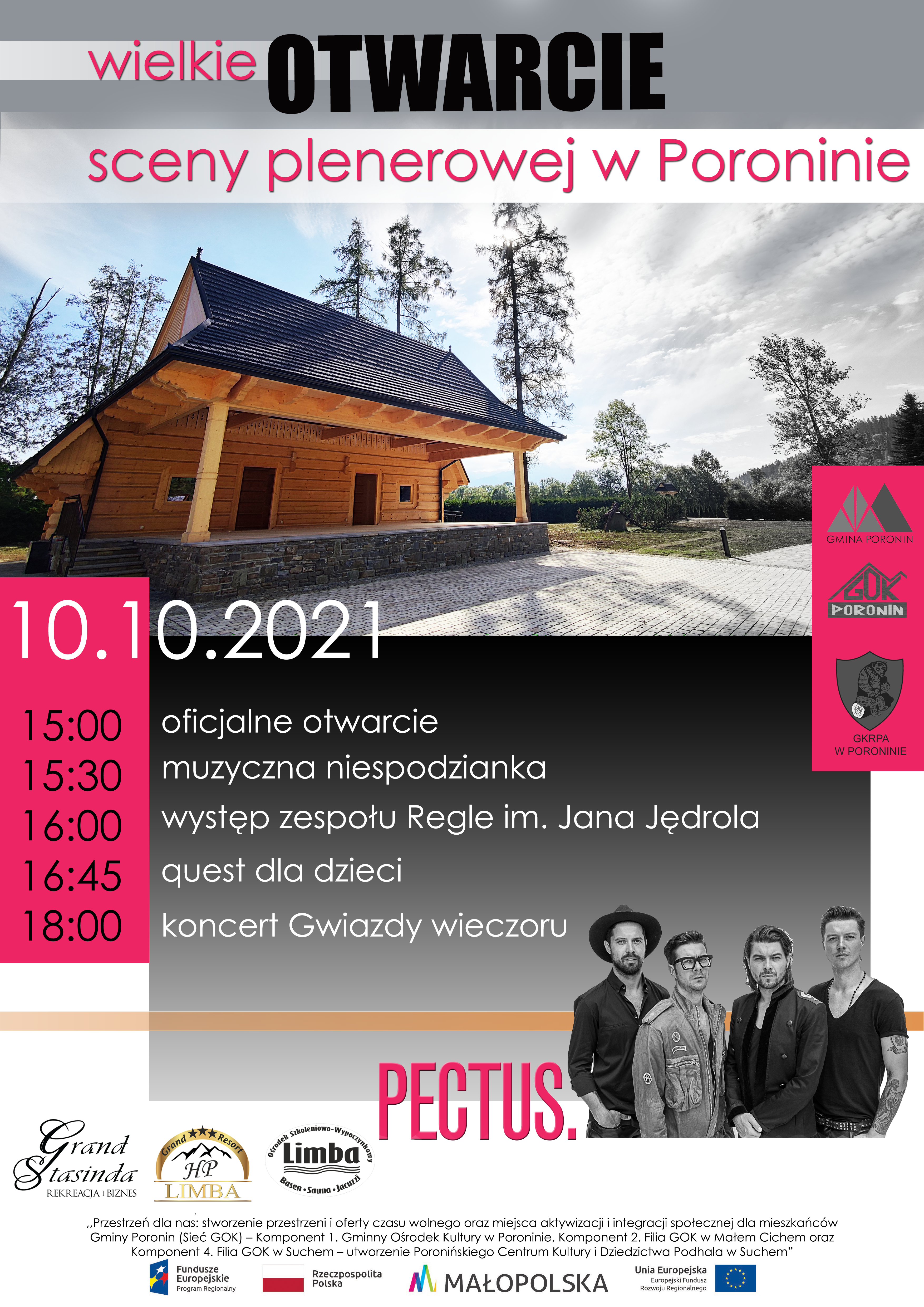 Wielkie otwarcie parku oraz nowej sceny plenerowej w Poroninie odbędzie się 10 października 2021 r. Planowane są występy gwiazd, zespołów oraz wiele wiele innych atrakcji i niespodzianek. Zapraszamy na teren Gminnego Ośrodka Kultury w Poroninie.