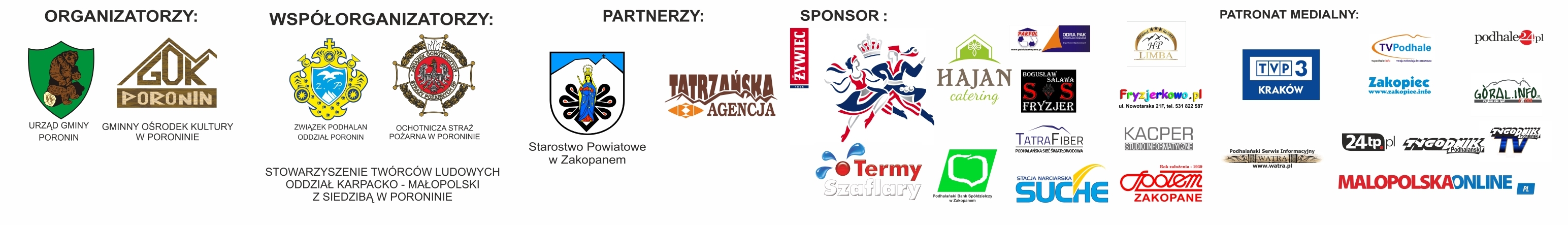 Bardzo serdecznie dziękujemy mediom. Patronat nad tegoroczną imprezą sprawowały: Telewizja Polska S.A. Oddział w Krakowie, Tygodnik Podhalański, TV Tygodnik Podhalański, TVPodhale, Malopolskaonline.pl, Podhalański Portal Informacyjny podhale24.pl, Góral.info oraz Podhalański Serwis Informacyjny WATRA.