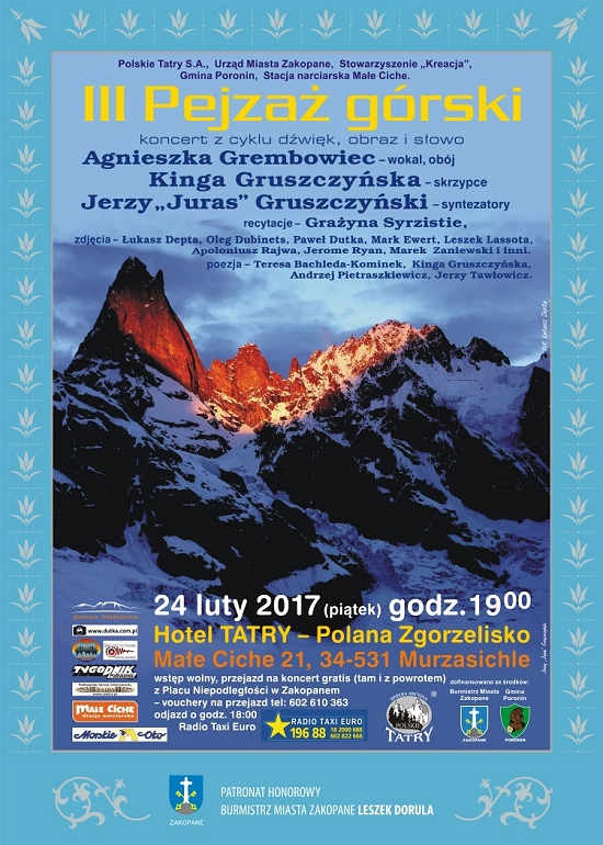 Zapraszamy na koncert z cyklu dźwięk, obraz i słowo w wykonaniu Agnieszki Grębowiec, Kingi Gruszczyńskiej i Jerzego "Jurasa" Gruszczyńskiego 24 lutego 2017 o godz. 19.00 w hotelu "Tatry" - Polana Zgorzelisko.