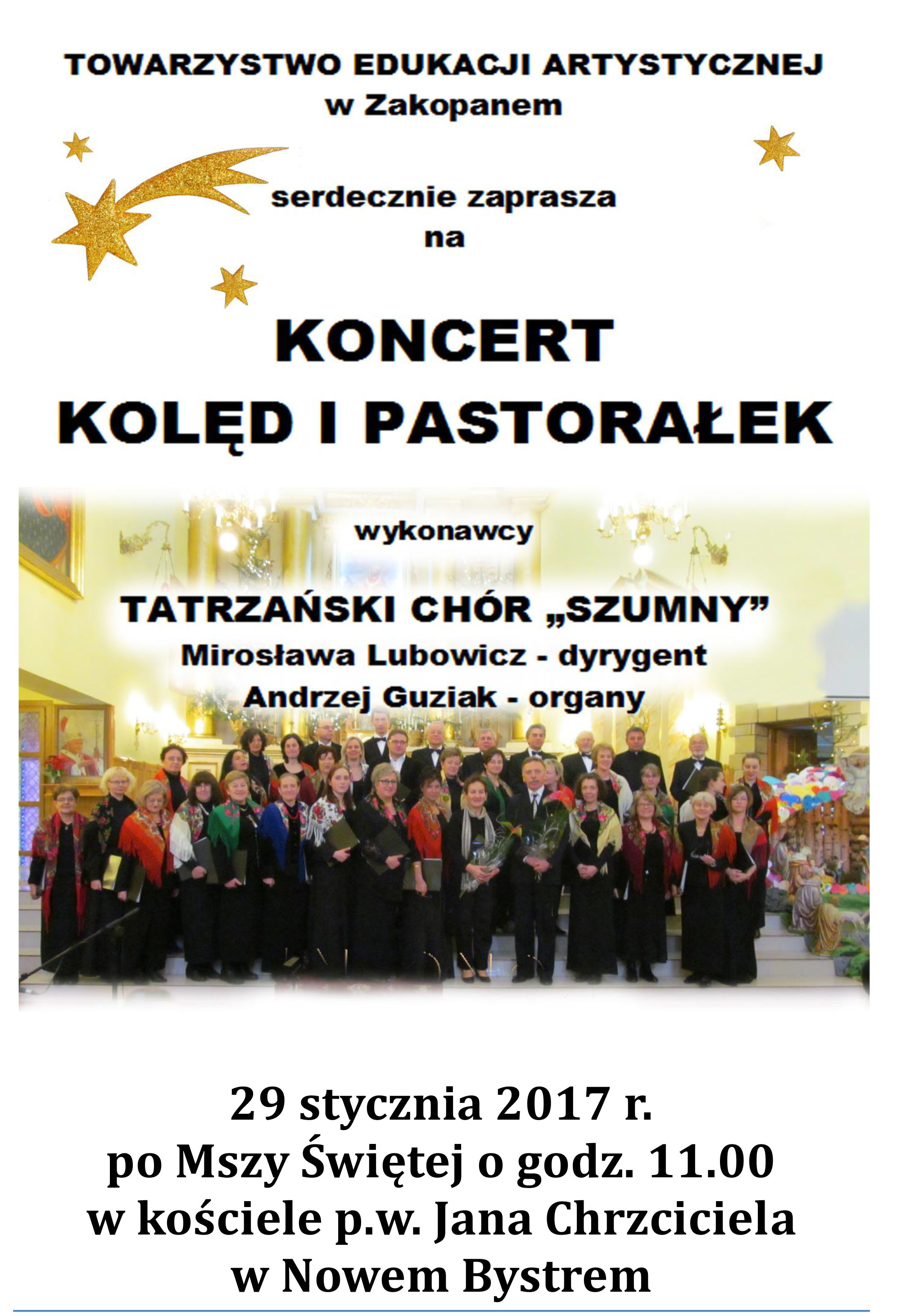 W dniu 29 stycznia 2017 r. po Mszy Świętej o godz. 11.00 w kościele p.w. Jana Chrzciciela w Nowem Bystrem serdecznie zapraszamy na Koncert Kolęd i Pastorałek w wykonaniu Tatrzańskiego Chóru :SZUMNY"