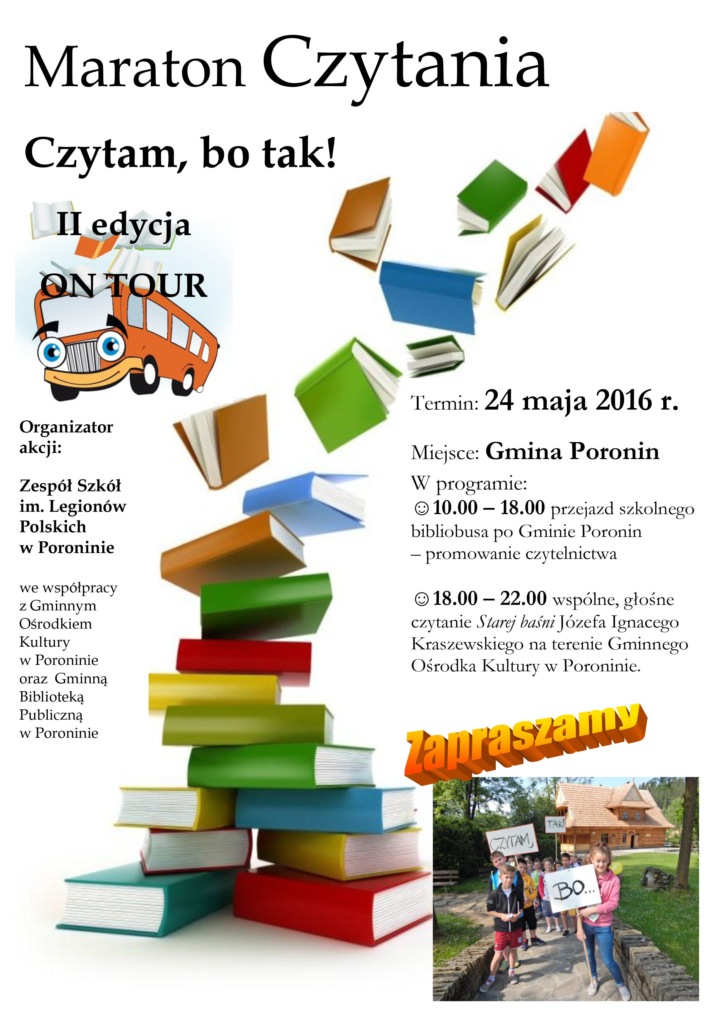 Maraton Czytania odbędzie się 24 maja 2016 r. na terenie Gminy Poronin.