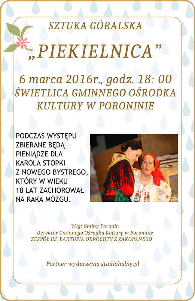 Wójt Gminy Poronin, Dyrektor Gminnego Ośrodka Kultury w Poroninie oraz Zespół regionalny im. Bartusia Obrochty serdecznie zapraszają na sztukę „PIEKILENICA”. Sztuka będzie wystawiona 6 marca 2016 r. o godz. 18:00 w świetlicy Gminnego Ośrodka Kultury w Poroninie. Datki zbierane podczas przedstawienia będą przeznaczone na dalsze leczenie naszego muzykanta Karola Stopki z Nowego Bystrego, który zachorował na raka mózgu.