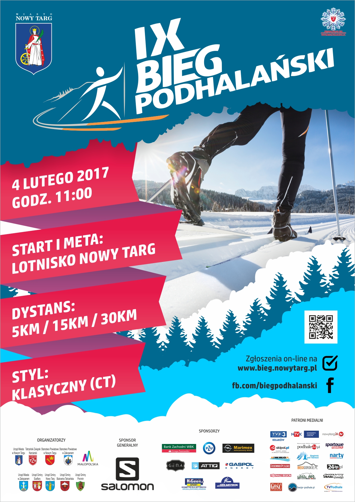 Serdecznie zapraszamy do udziału w IX Biegu Podhalańskim im. Jana Pawła II w Nowym targu, który został zaplanowany na dzień 4 lutego 2017 r. (sobota). Trasa dziewiątej edycji zawodów poprowadzona zostanie tradycyjnie wokół rezerwatu przyrody Bór Na Czerwonem. Start i meta znajdować się będą na lotnisku w Nowym Targu. Podobnie jak w latach ubiegłych uczestnicy będą mieli do pokonania trasę 30, 15 lub 5 kilometrową. Co ważne, IX Bieg Podhalański został wpisany do kalendarza masowych biegów Polskiego Związku Narciarskiego jako jedna z edycji Pucharu Polski Amatorów w Biegach Narciarskich PZN. Zachęcamy do udziału w IX Biegu Podhalańskim, którego szczegóły zostały przedstawione na stronie internetowej www.bieg.nowytarg.pl Tymczasem przedstawiamy jego filmową zapowiedź