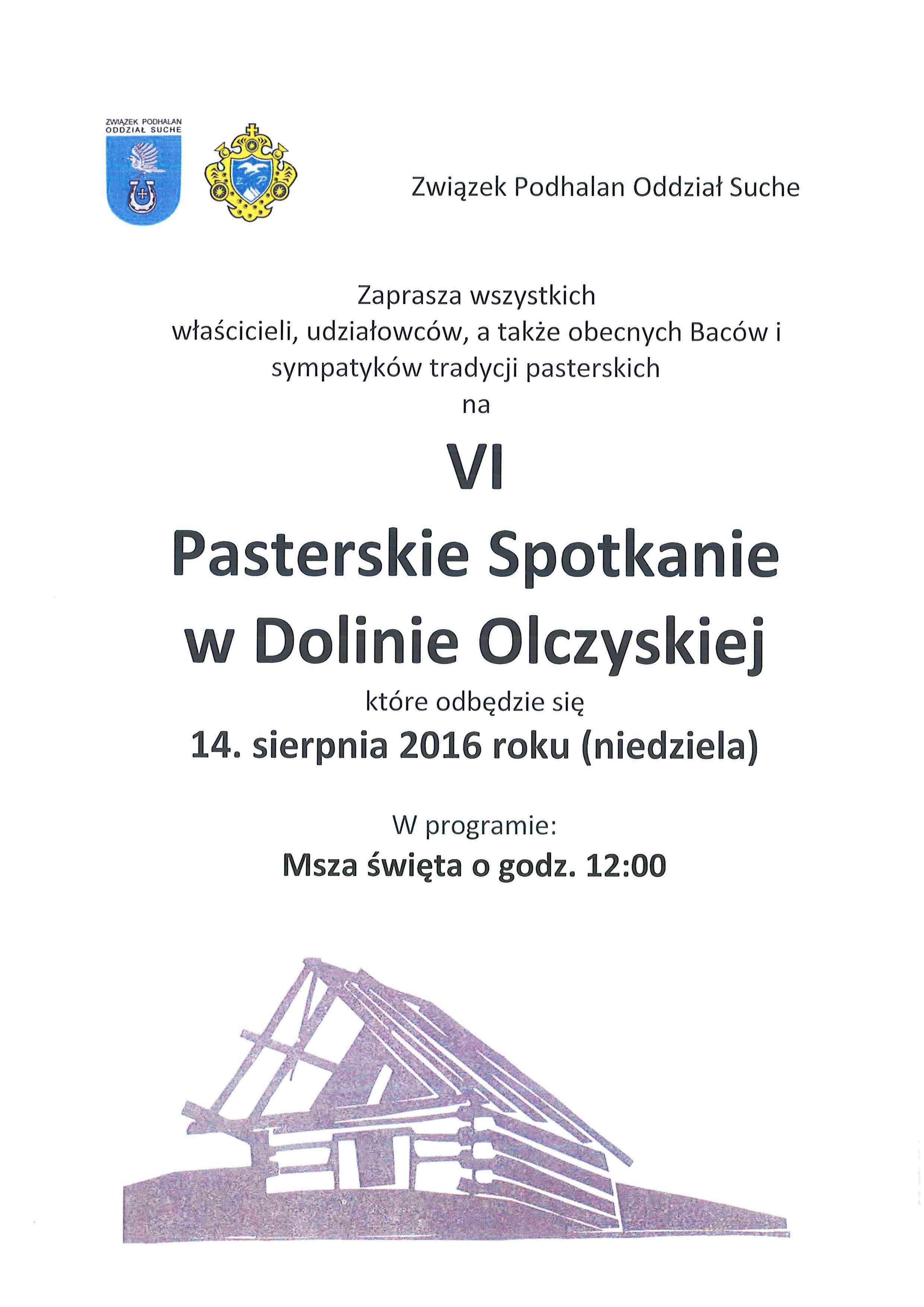 VI Pasterskie Spotkanie w Dolinie Olczyskiej, odbędzie się 14 sierpnia 2016 r. (niedziela) o godz. 12:00.