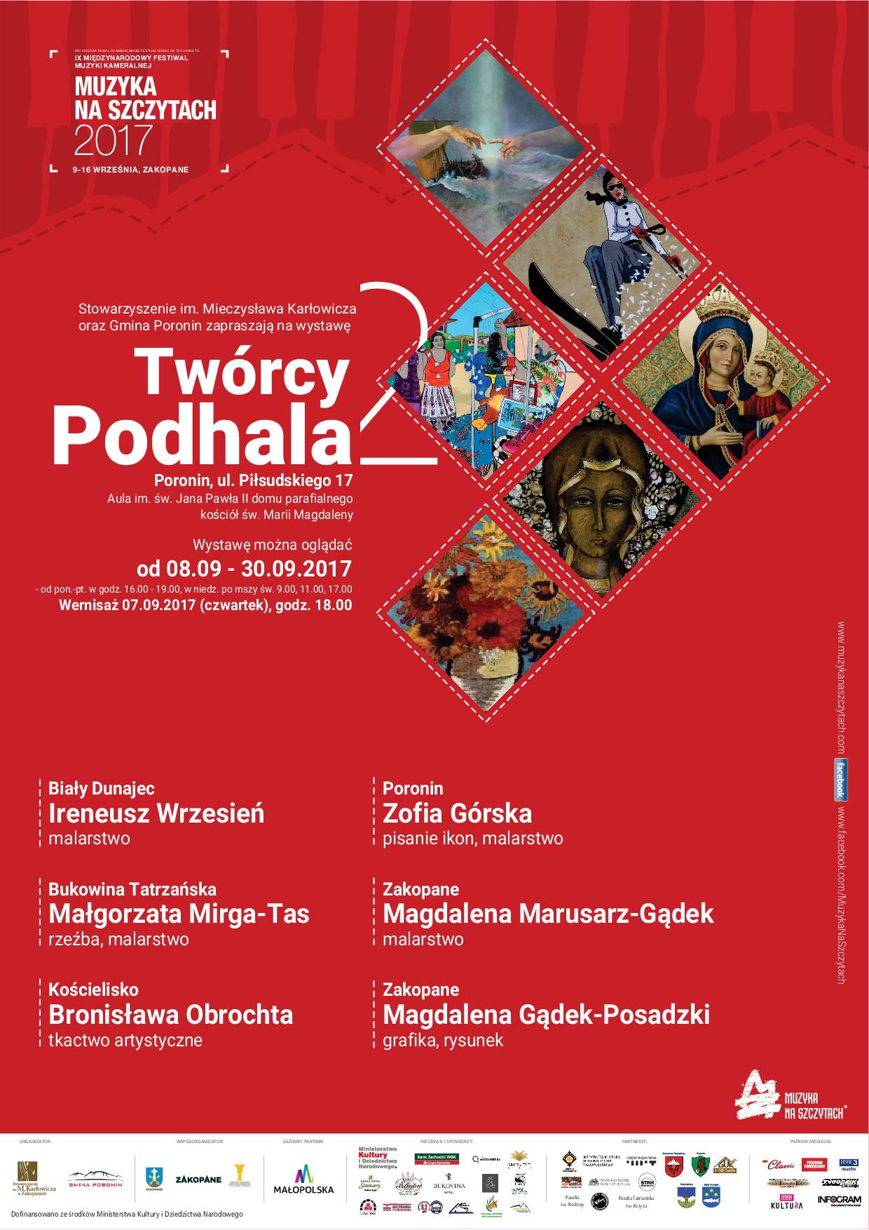 Swoje prace na wystawie zaprezentowali: Ireneusz Wrzesień (Biały Dunajec), Małgorzata Mirga –Tas (Bukowina Tatrzańska), Bronisława Obrochta (Kościelisko), Zofia Górska (Poronin), Magdalena Marusarz – Gądek (Zakopane), Magdalena Gądek – Posadzki (Zakopane).