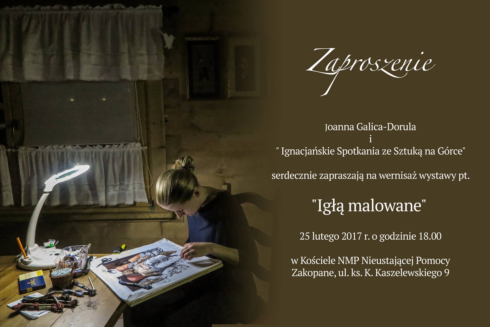 25 lutego o godzinie 18.00 zapraszamy na wernisaż wystawy obrazów wykonanych haftem płaskim "Igłą Malowane" Joanny Galicy-Doruli, który odbędzie się w ramach Ignacjańskich Spotkań ze Sztuką w Kościele O. Jezuitów na Górce, ul. Kaszelewskiego 9.