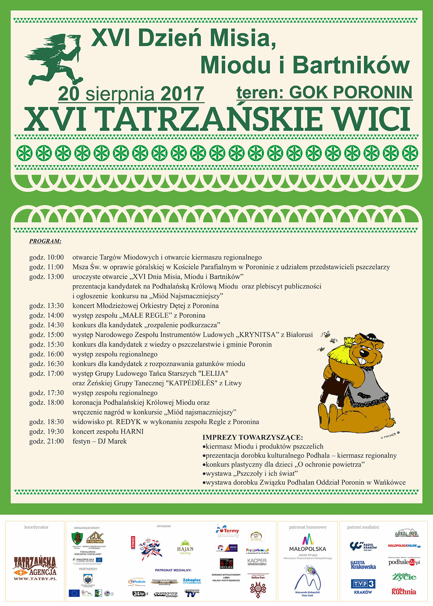Serdecznie zapraszamy na Dzień Misia, Miodu i Bartników, który odbędzie się 20 sierpnia 2017 r. /tj. niedziela/ na terenie Gminnego Ośrodka Kultury w Poroninie.